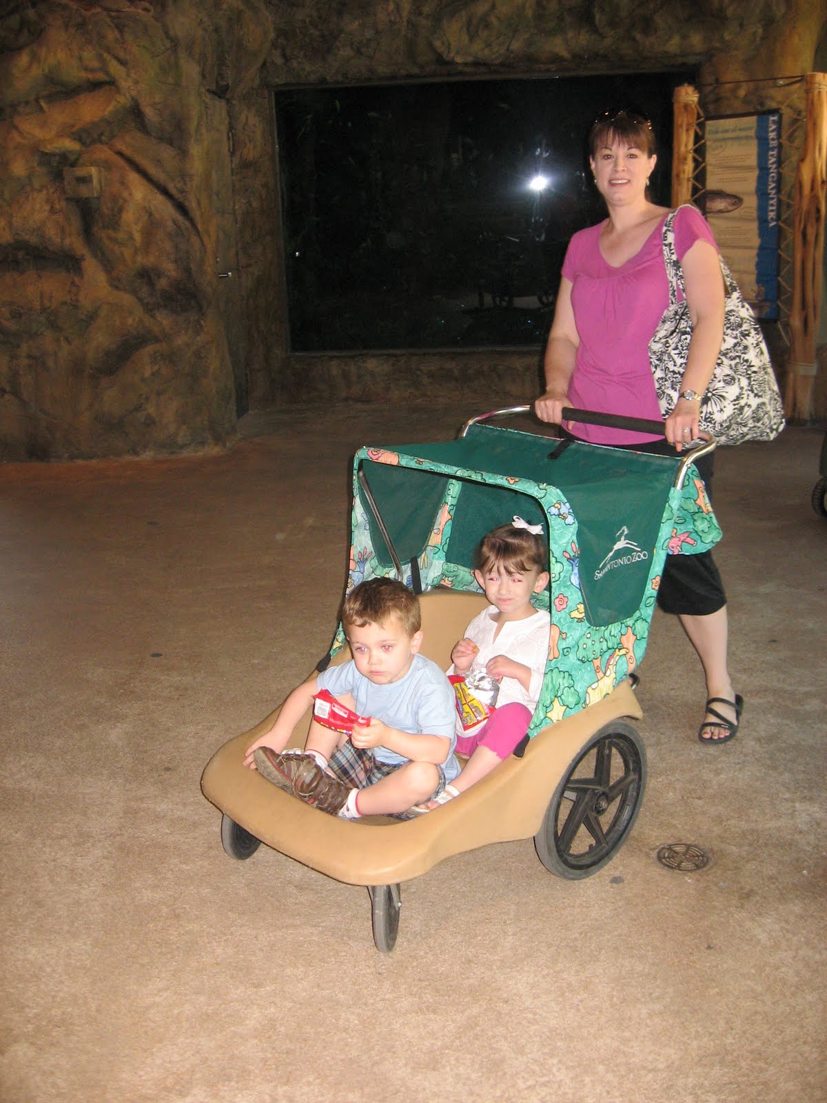 To finish off our San Antonio outing yesterday, we took the kids to the zoo. They did AWESOME!!! in a shared stroller and really seemed to just enjoy hopping in and out of the stroller and looking at the animals. We had a great encounter with a two HUGE hippotamuses. We happened to get right to their tank when they were showing off at the windows. We were up close and personal with them both. The butterfly exhibit was also a lot of fun for the kids to see. Lots of beautiful butterflies flitting about. Oh, and let's not forget Max's favorite, the elephant. We stopped into the petting farm but there was no food any of the 3 containers so the kids only got to brush the goats. We ate a nice picnic lunch and topped the day off with a nice leisurely train ride. Max was super pooped last night and went to be without a fuss and slept until 8 this morning (and I got to watch Glee since I missed it last night...SCORE!) It was a great day!
